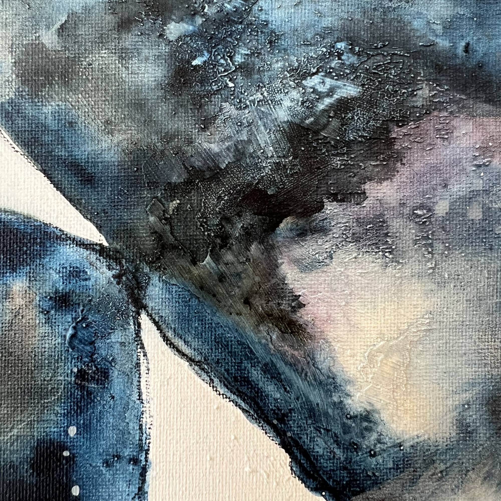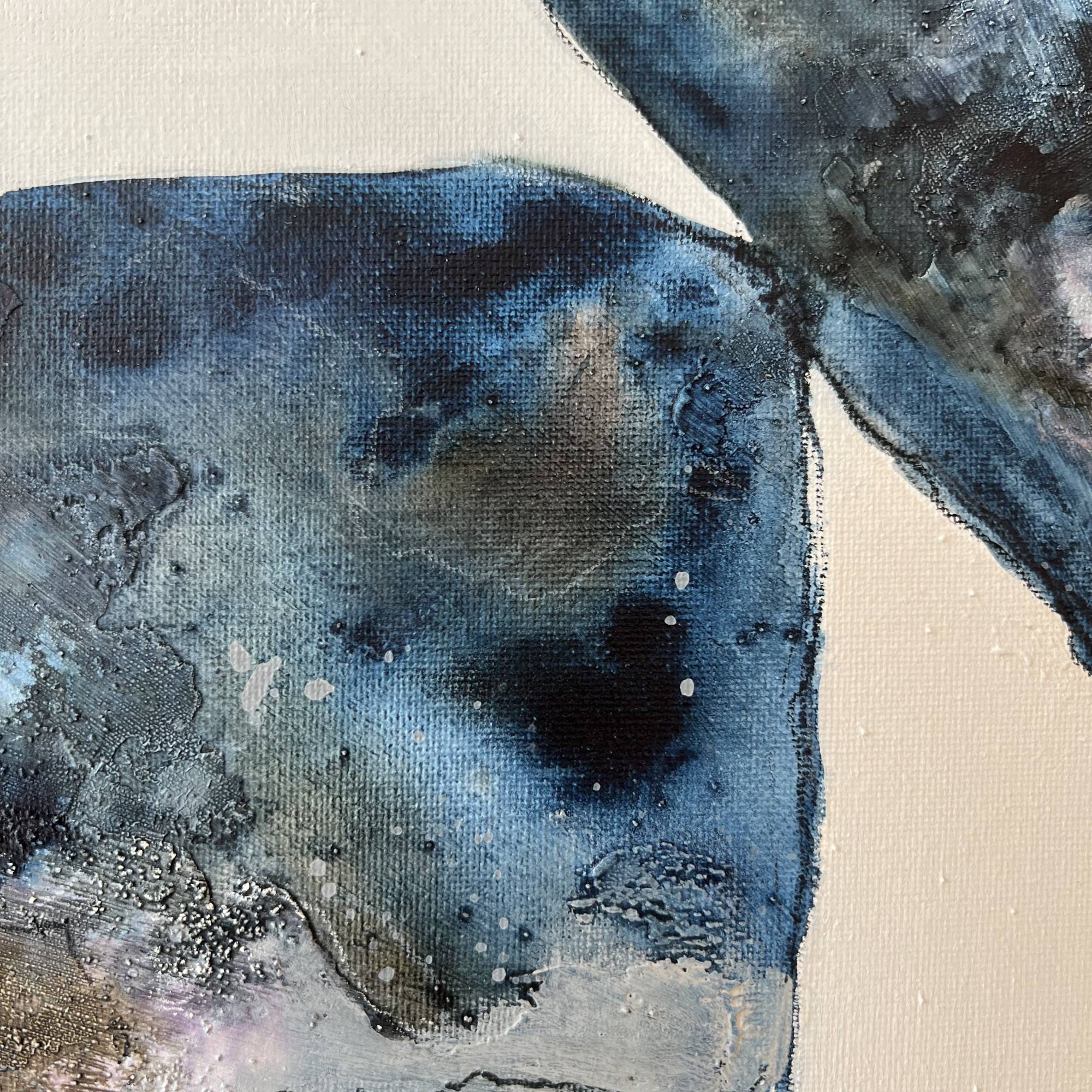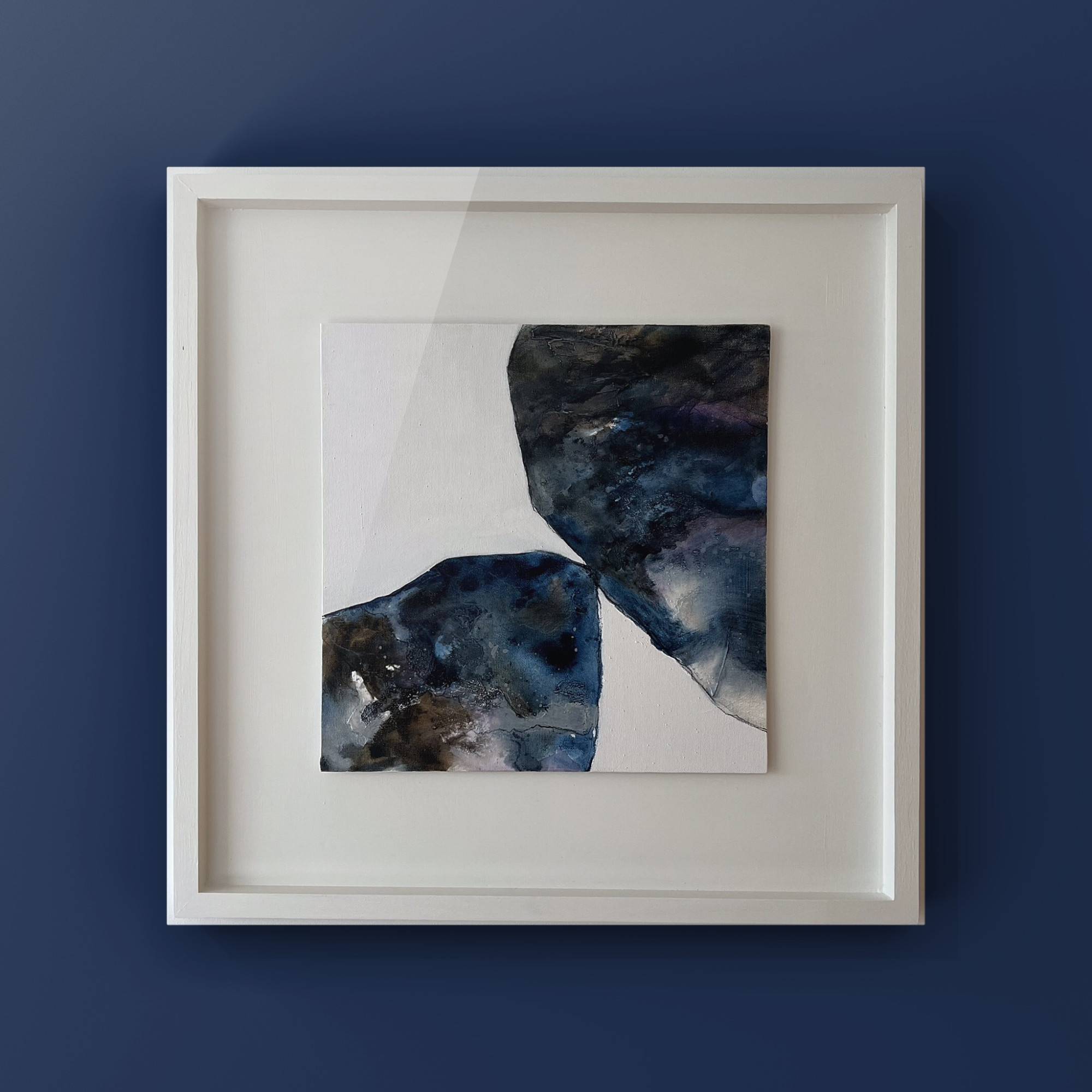 A colourful and gently textured painting evoking mussel shell collecting on the beach. Float framed in a handpainted off white wooden tray frame and ready to hang.