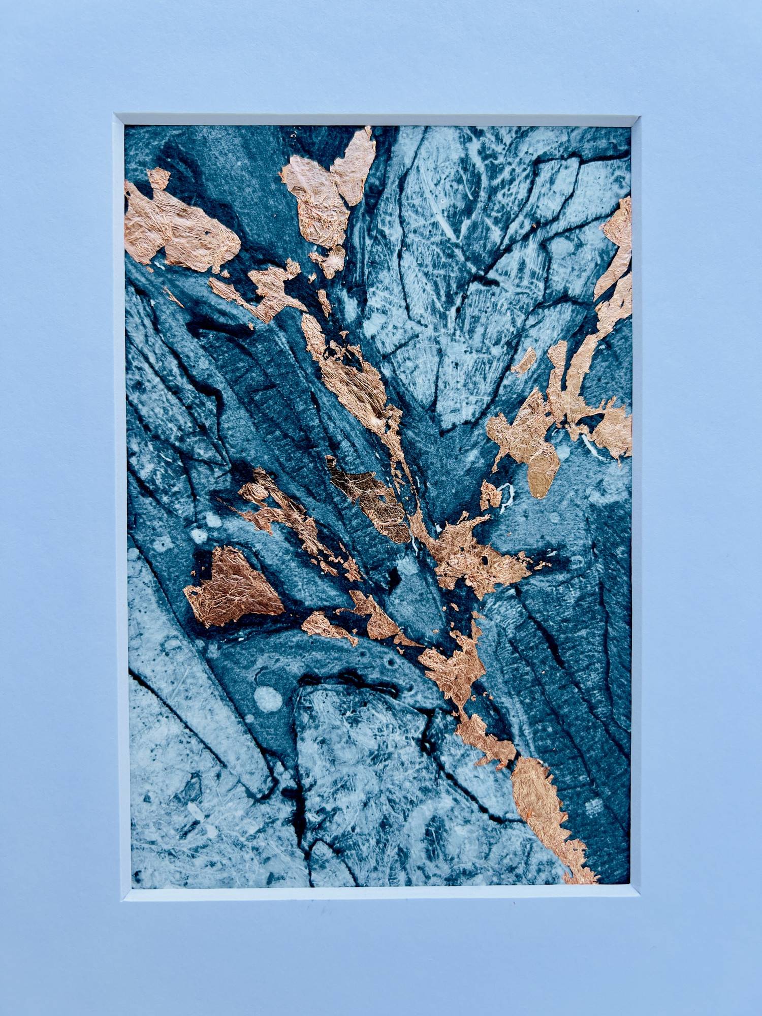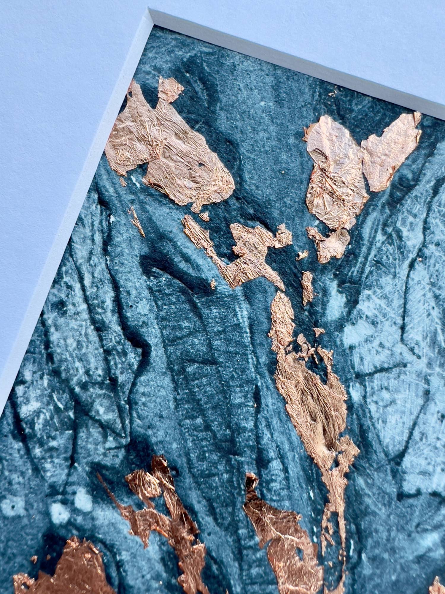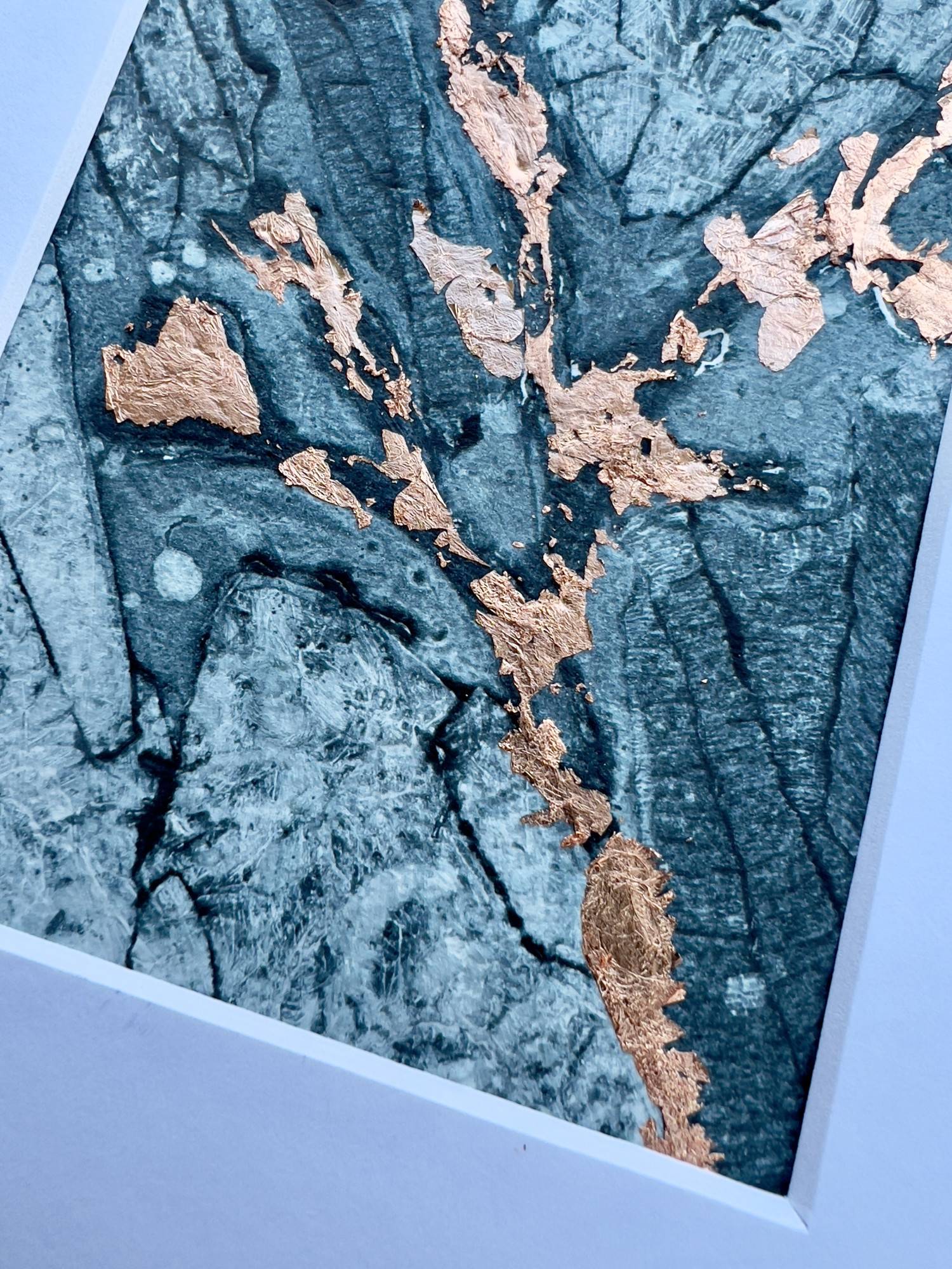 Handprinted original abstract collagraph print embellished with copper leaf.
