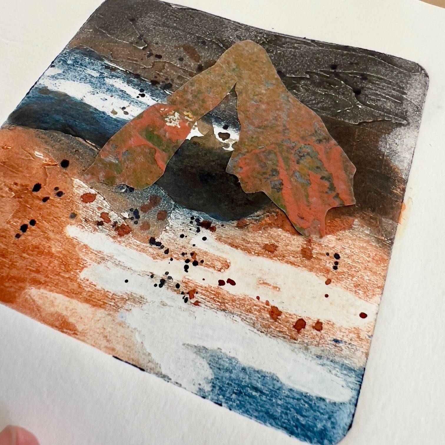 Three handprinted collagraphs, with additional copper ink and collage of handprinted papers, framed together in a glazed wooden frame. An abstract expression of glances of the summer water's edge.