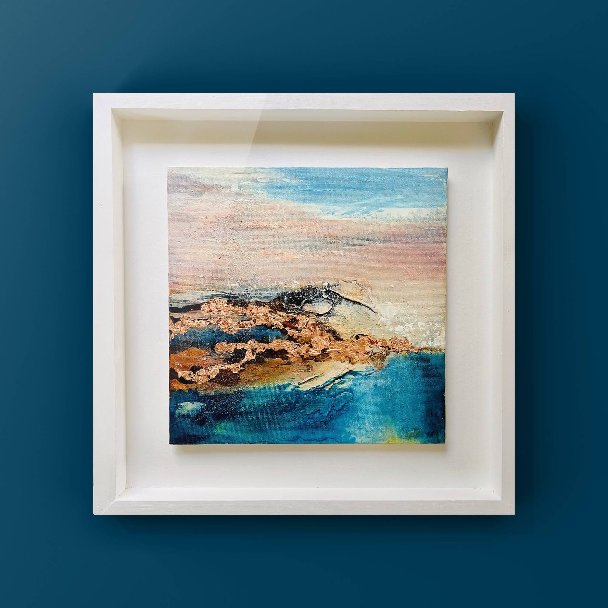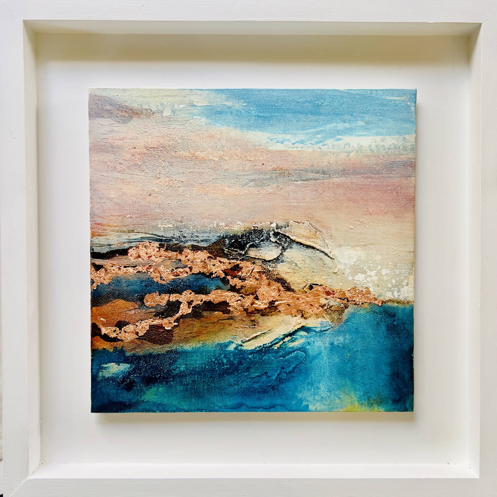 Canvas panel float mounted in a handpainted white wooden tray frame.