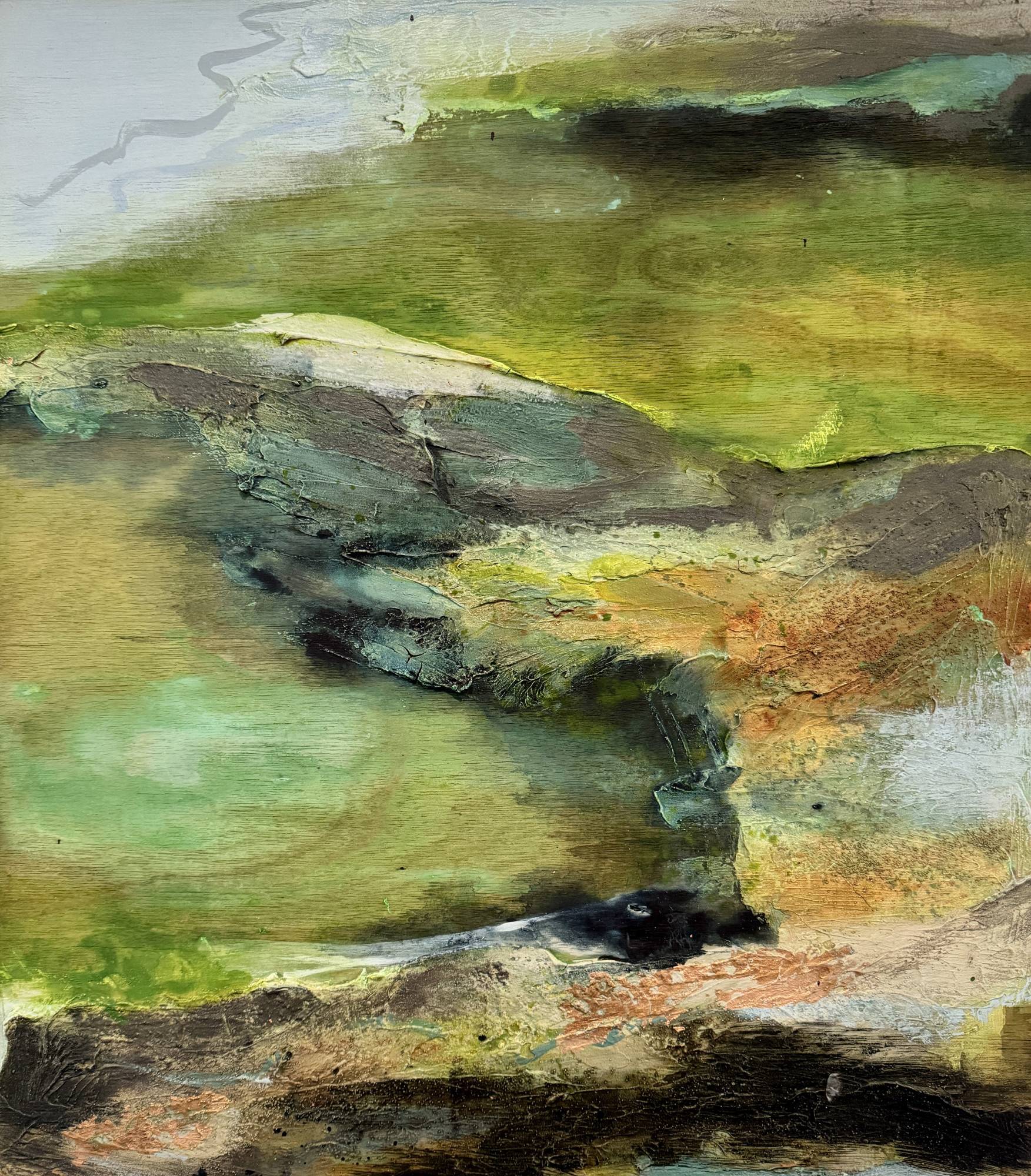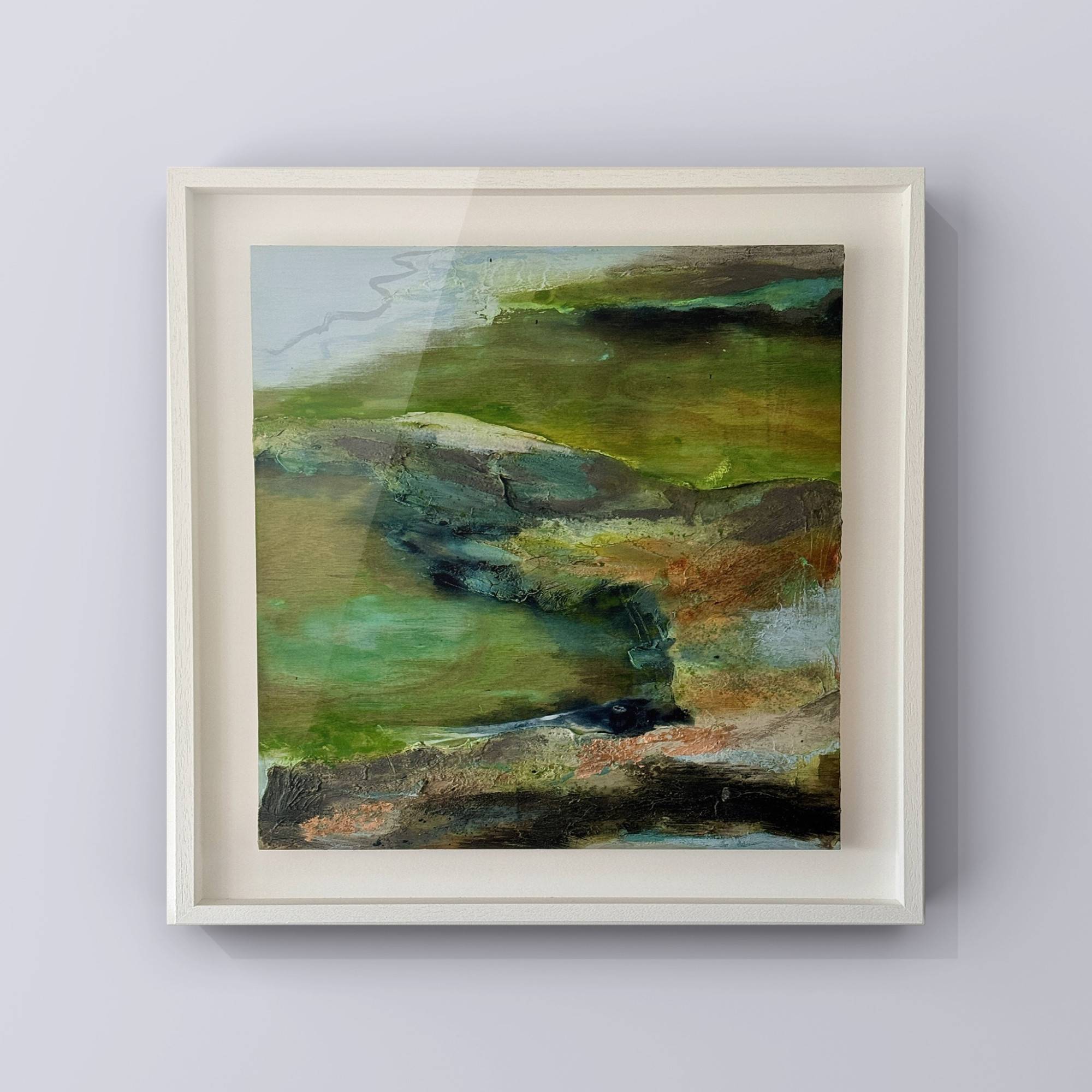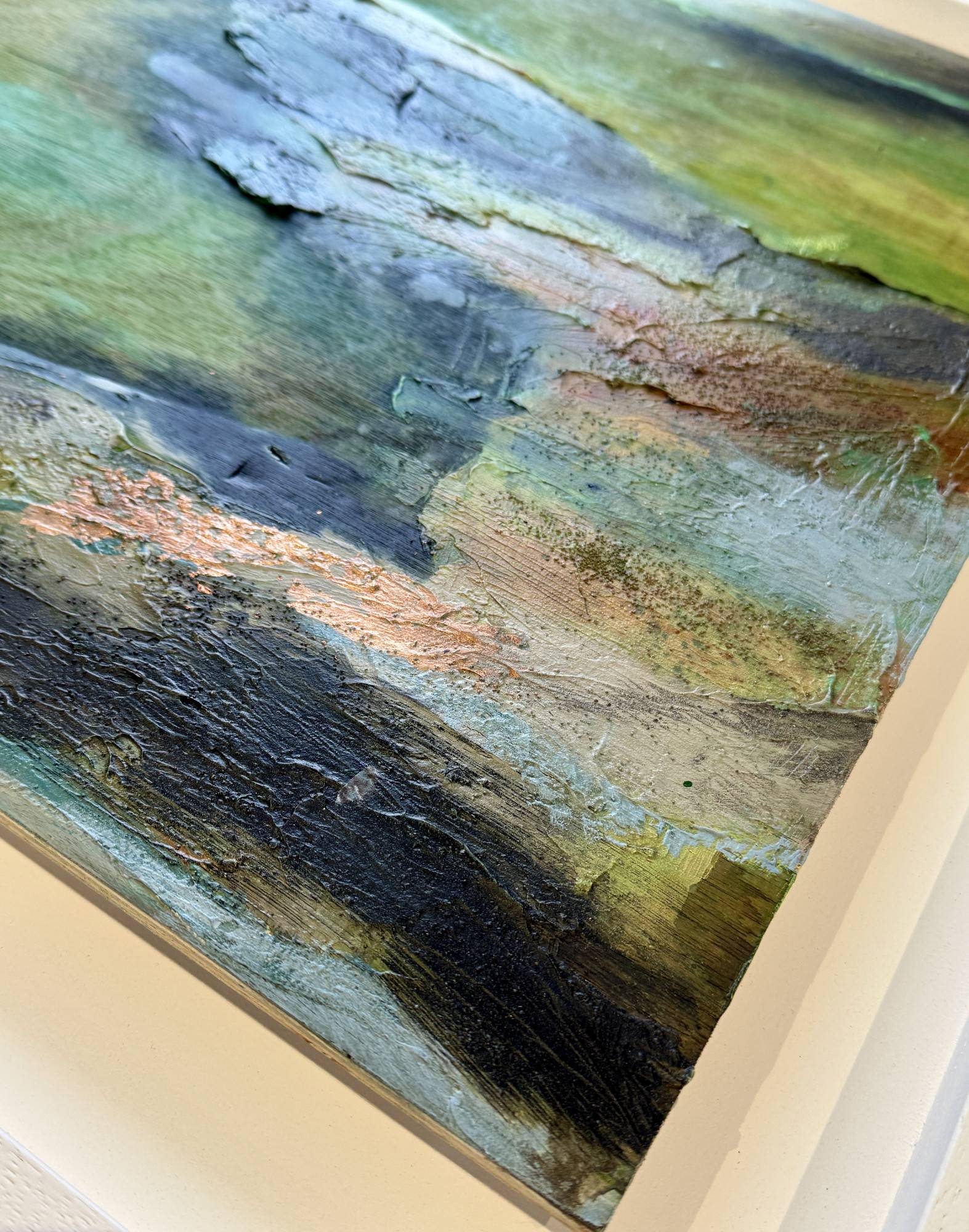 Inspired by the green-hued and rocky tidal pools at Watergate Bay. Cool and clear and perfect for winter dips for Seth, my four legged studio assistant! His favourite place honoured in this textured work on plywood panel, highlighted with copper leaf.