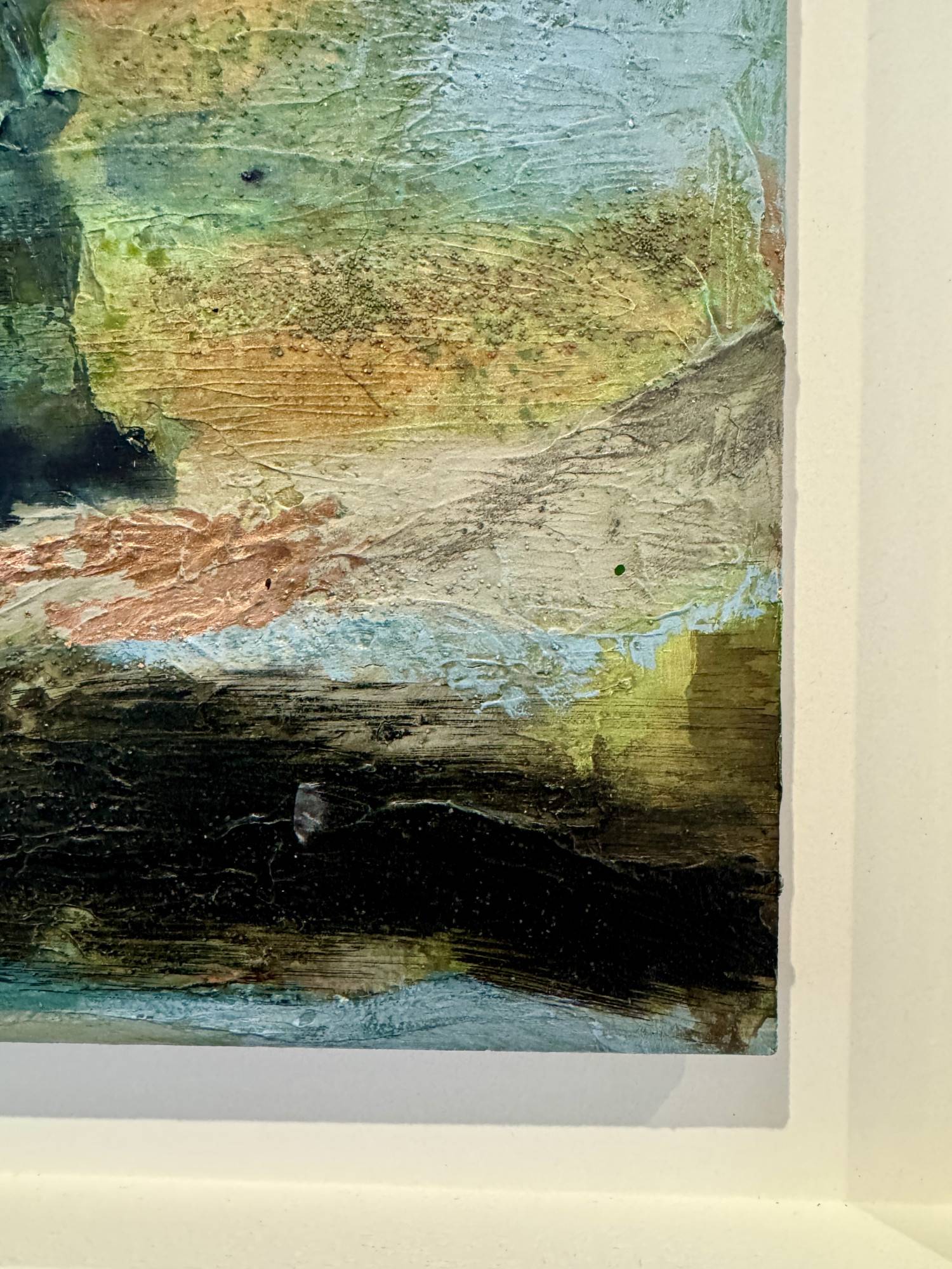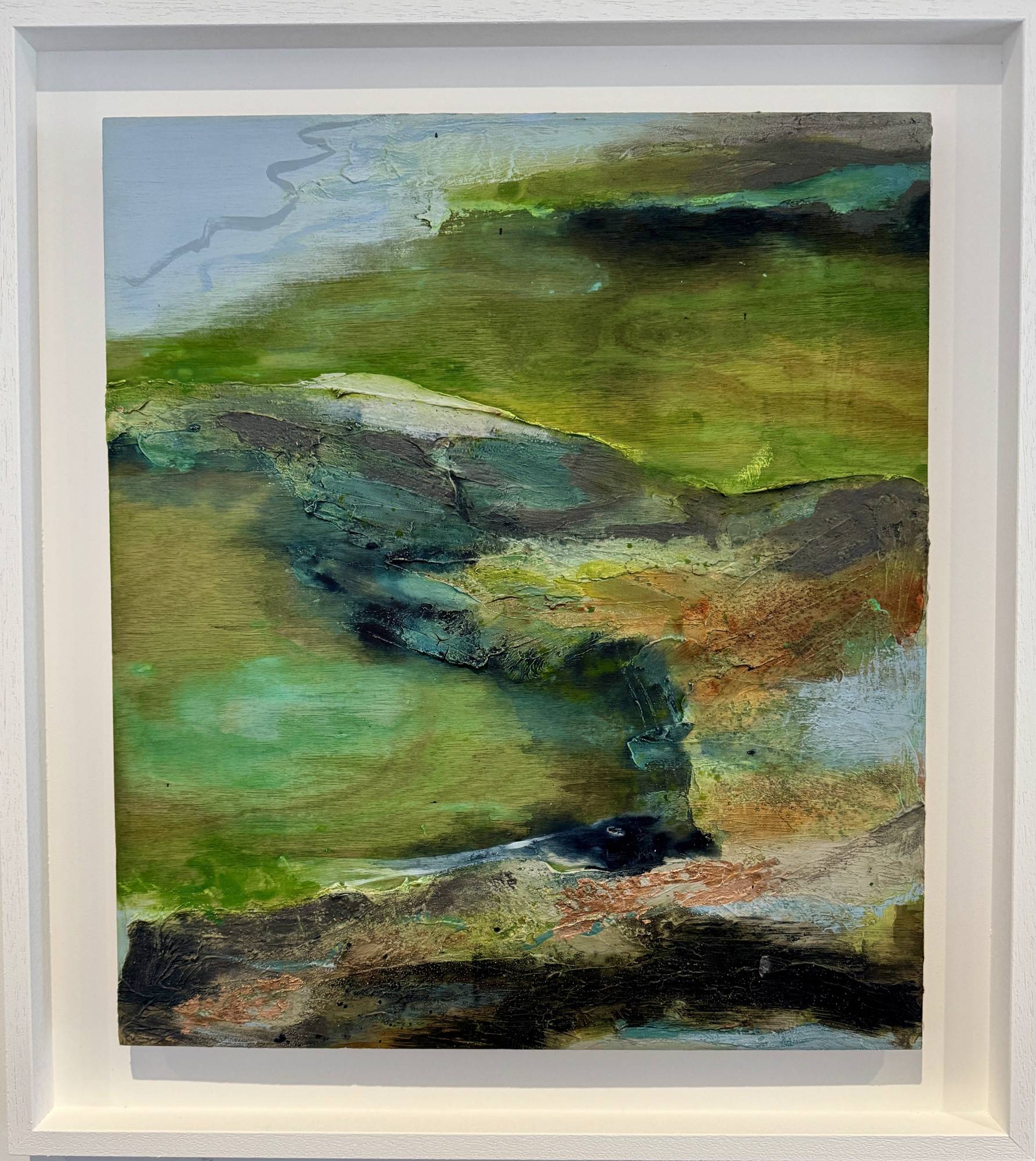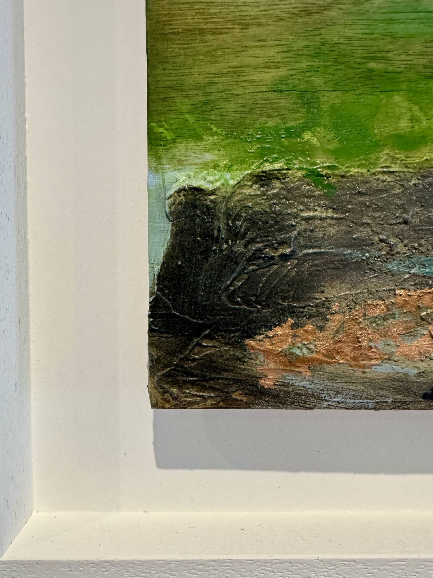 Inspired by the green-hued and rocky tidal pools at Watergate Bay. Cool and clear and perfect for winter dips for Seth, my four legged studio assistant! His favourite place honoured in this textured work on plywood panel, highlighted with copper leaf.