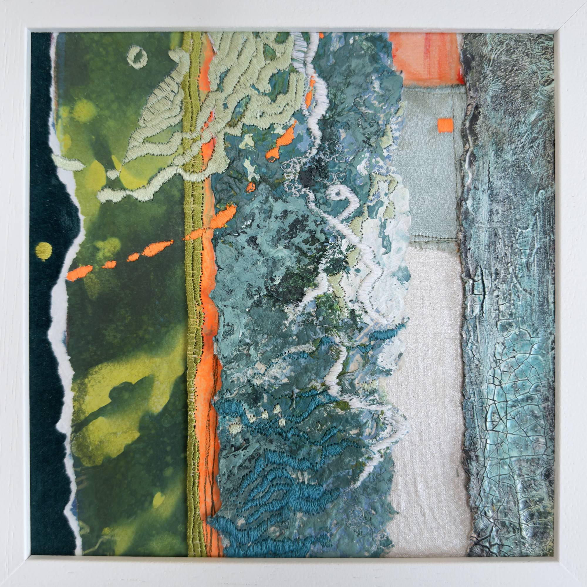 An assemblages of painted and printed papers, original cyanotype, ink, paint and stitch with canvas and crackle textures. Floating on high, a gull's eye view of the beautiful coast.
