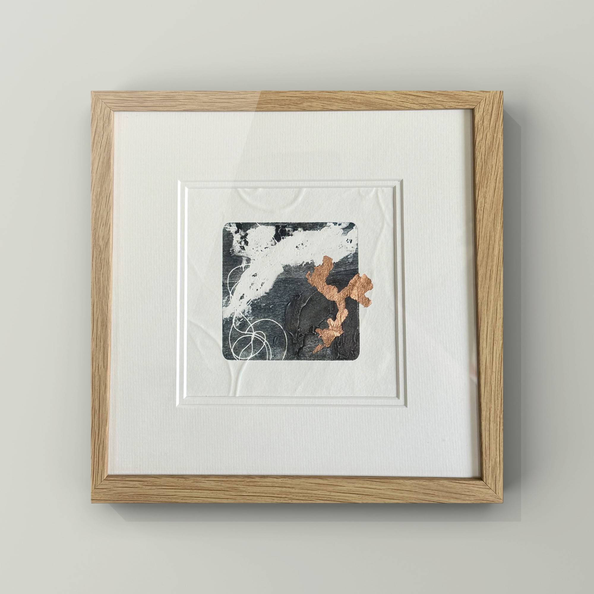 Handprinted collagraph with embossed edge and copper leaf enhancement. Framed and ready to hang.