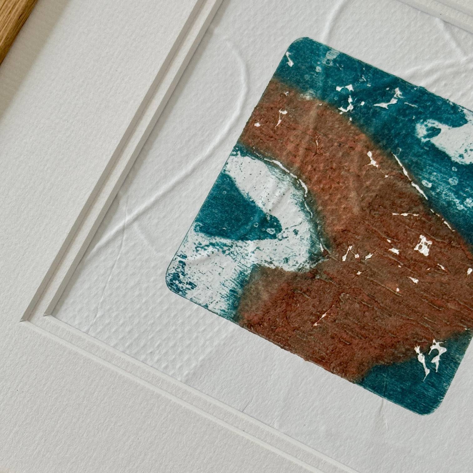 Hand printed and embossed collagraph print in a wooden frame.