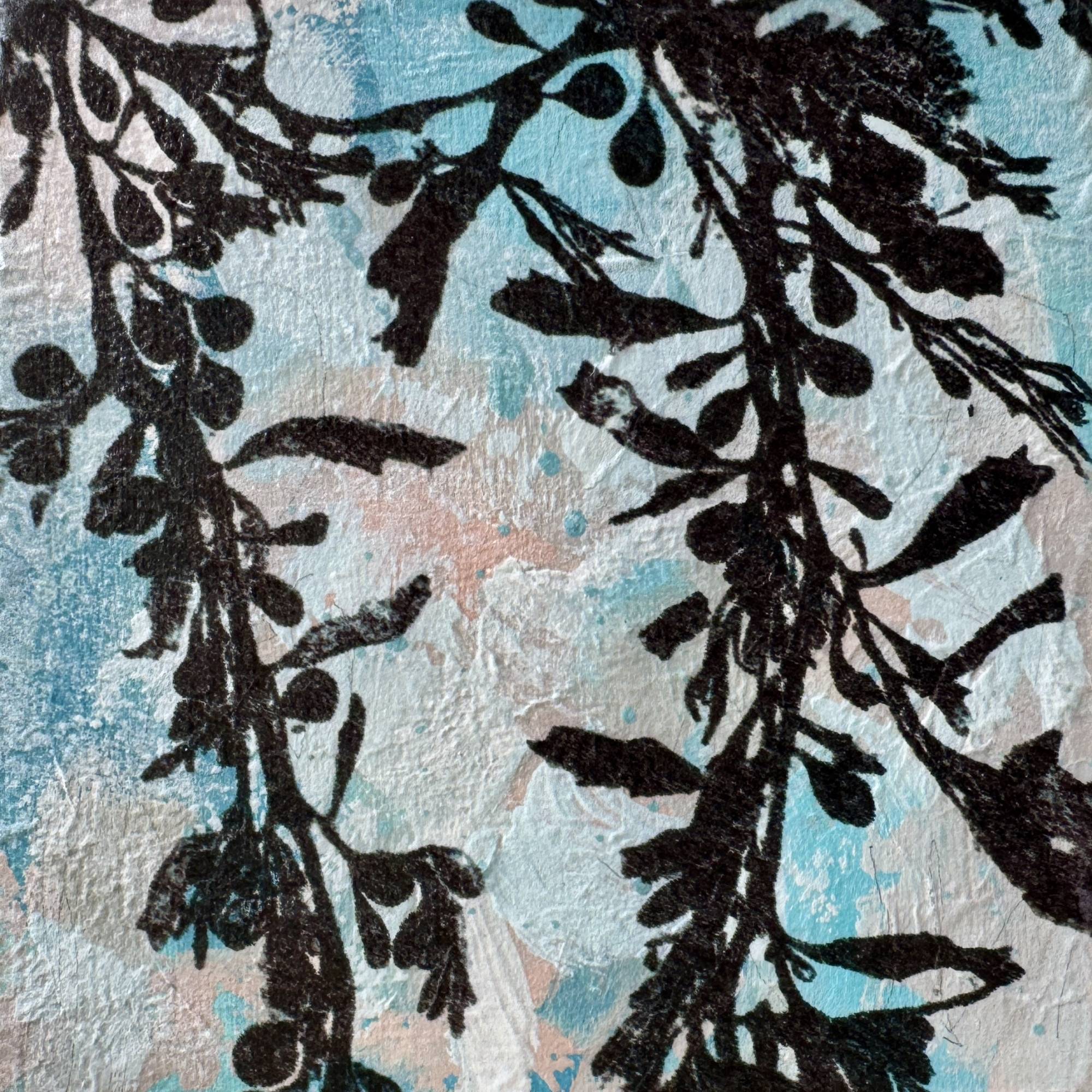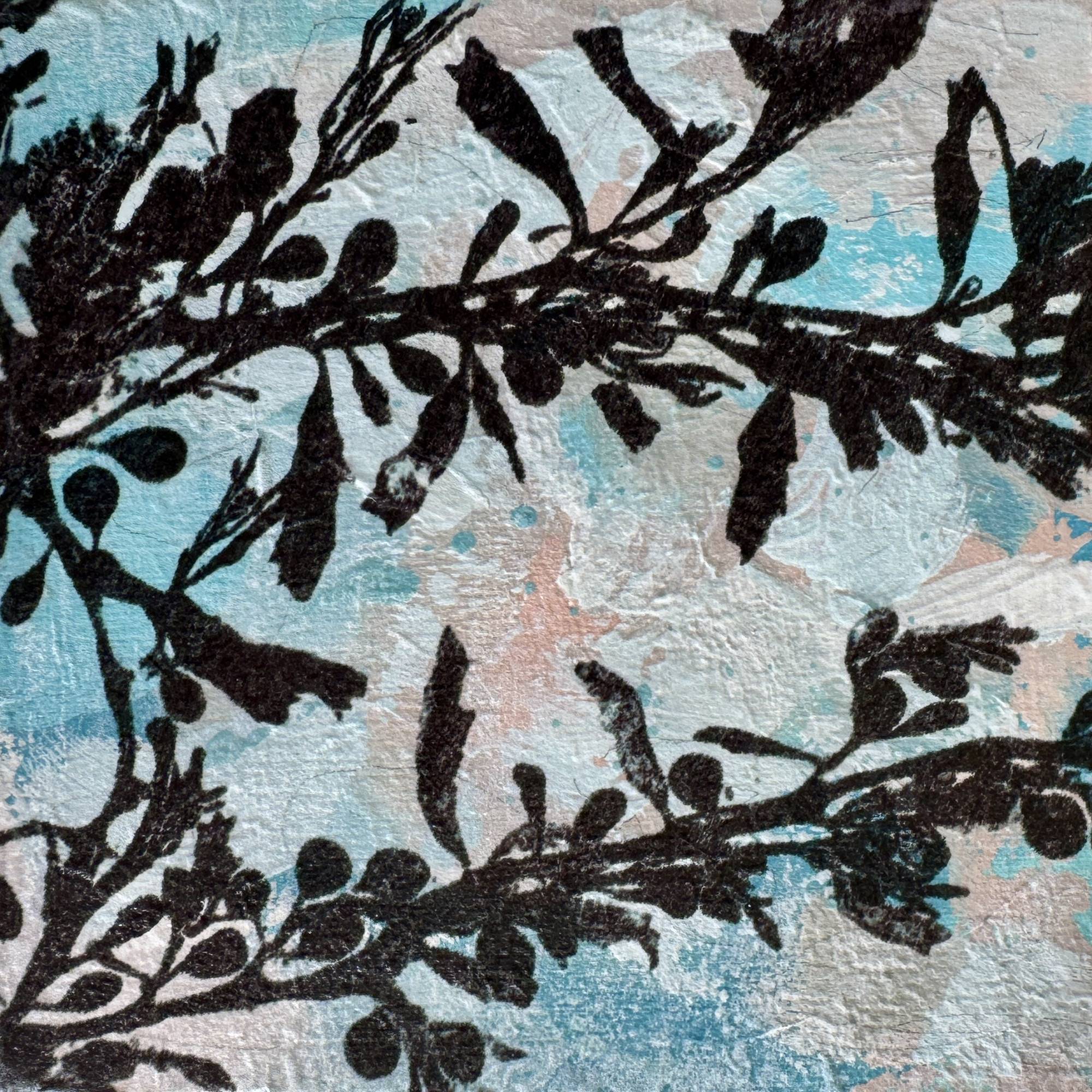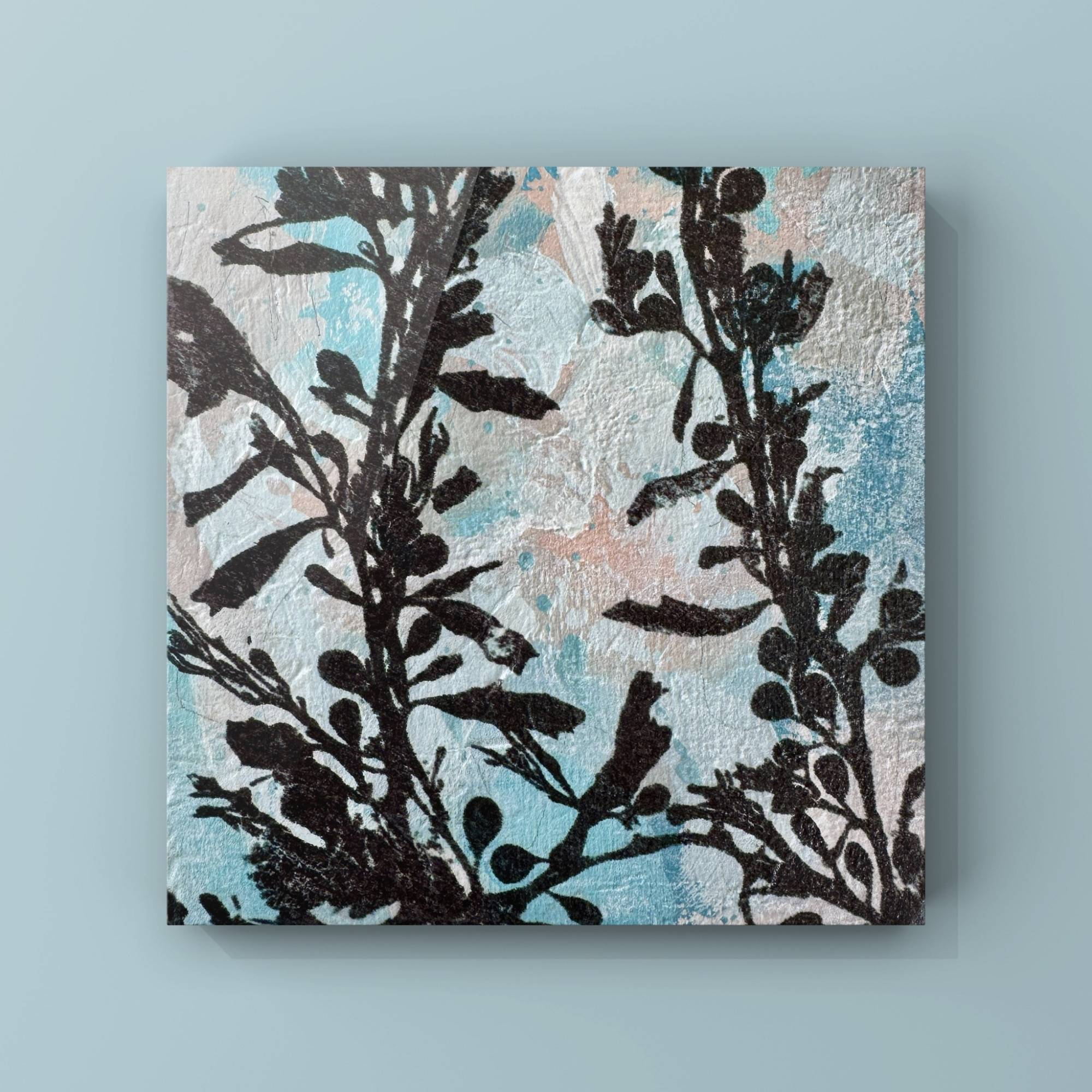 Painted on a chunky 4cm deep cradled panel with a fine photographic collage of one of my seaweed photographs, this piece stands happily on a shelf, or can be wall hung as it is or framed.